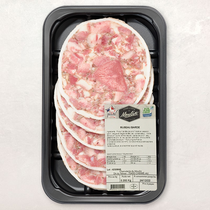 Ce museau avec barde tranché est préparé avec soin selon une recette traditionnelle, ce qui lui confère une texture et un goût uniques.