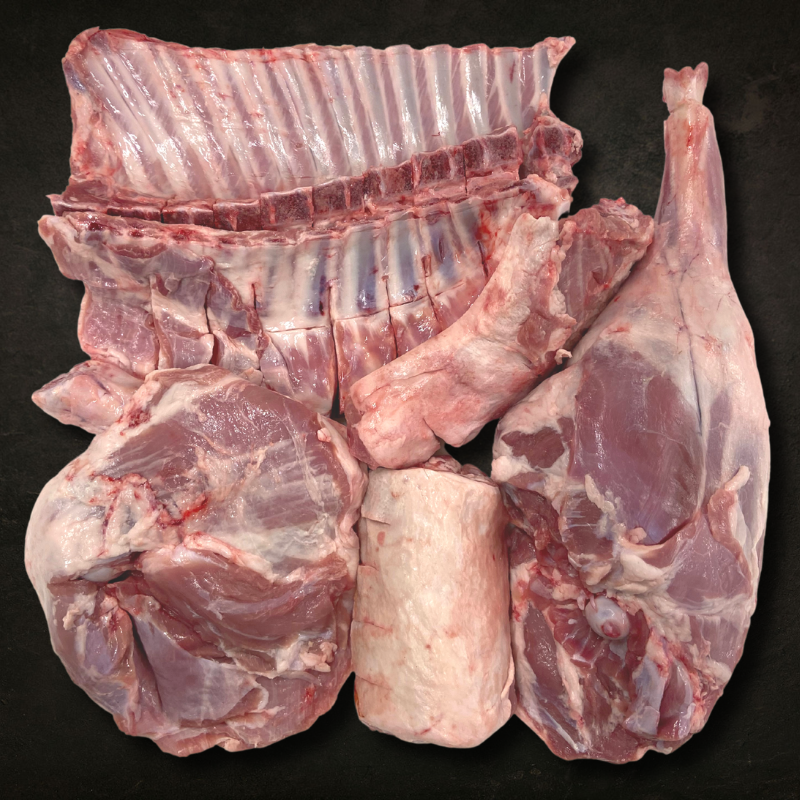 Un magnifique demi agneau de lait des Pyrénées découpé dans notre atelier à Rungis par notre chef boucher en collier, gigot, épaule, selle, carré prétranché et poitrine.